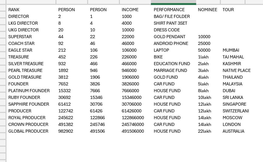 * Joining Package Amount 8 : 200000 Rs. = 500 P.V.